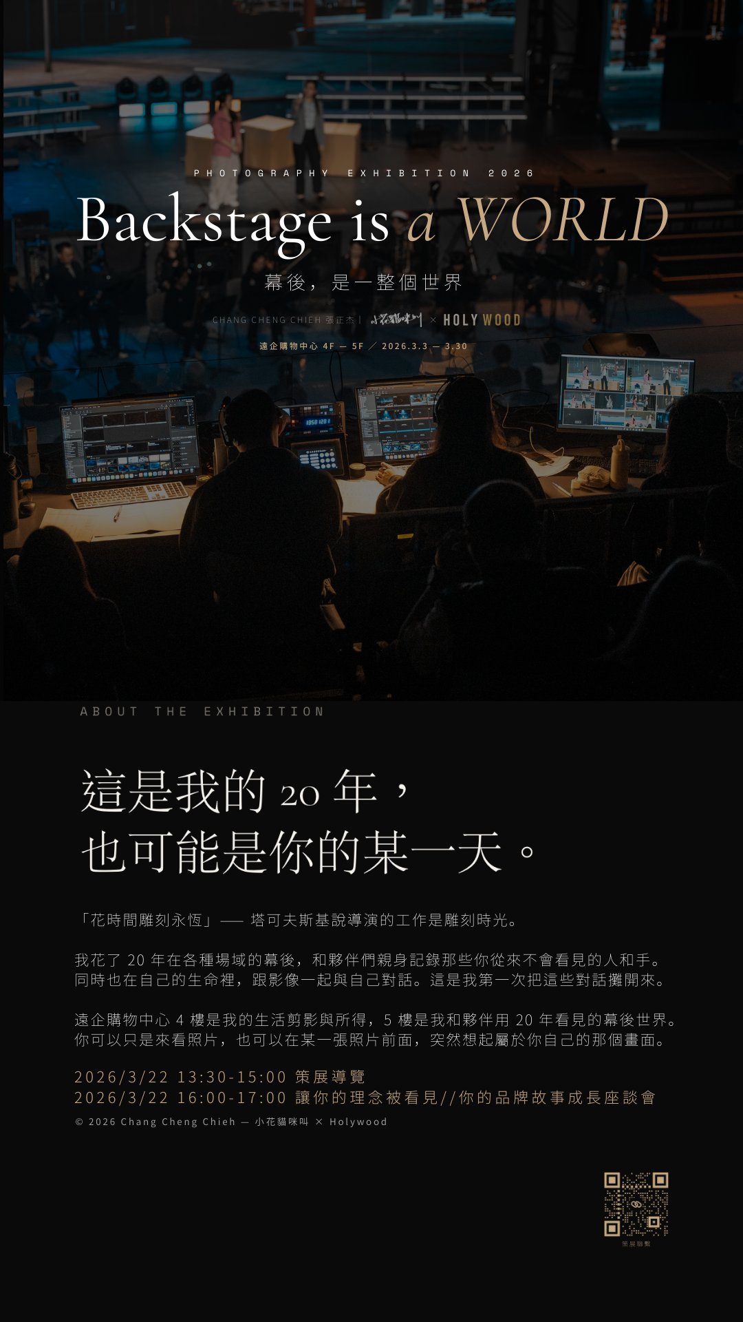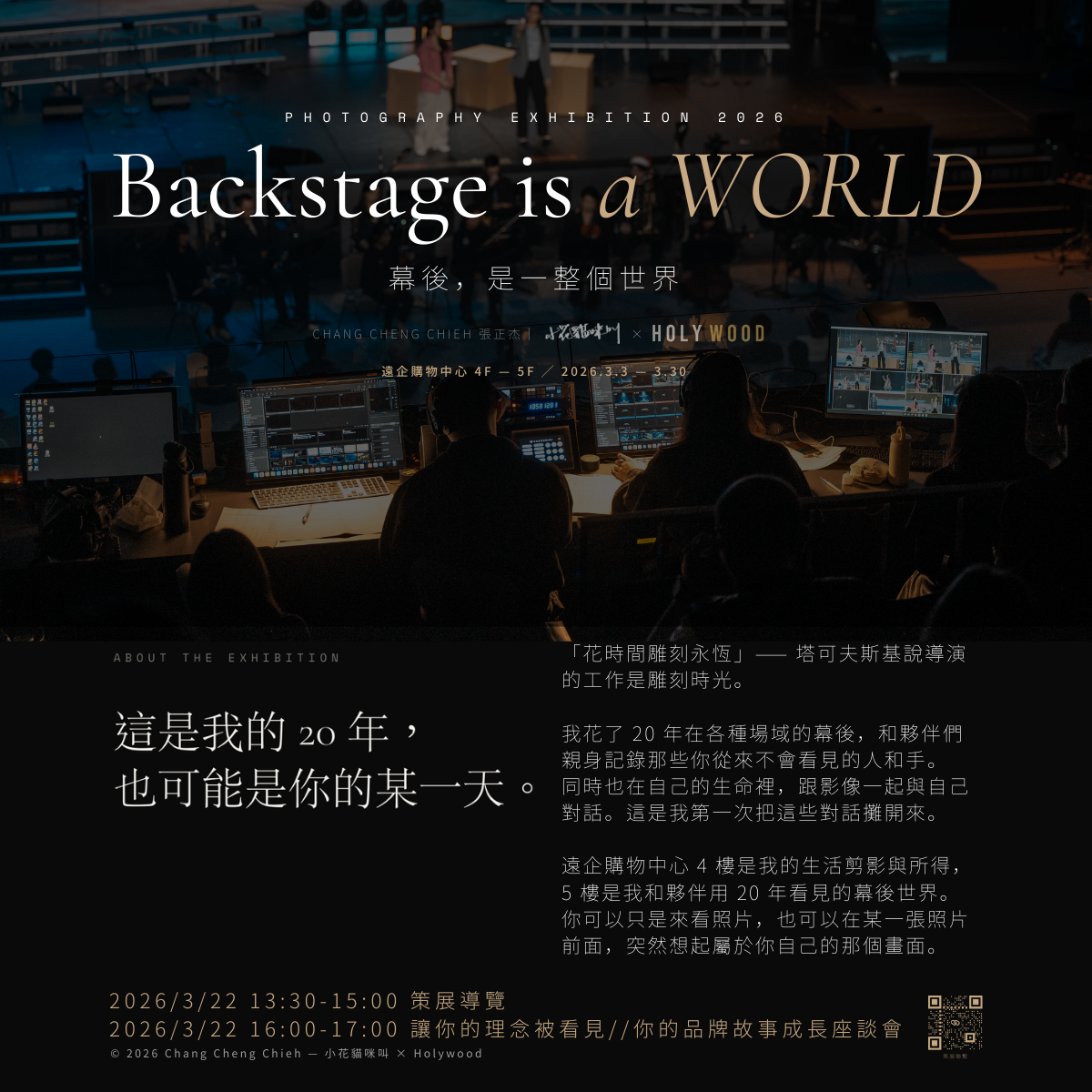 「Backstage is a WORLD」由導演、影像創作者張正杰策劃,以跨越 20 年的幕後影像及生命影像為核心,於遠企購物中心 4F、5F 展出。4F「我在時間裡」以九個章節展開對光、家人、自我、信仰與時間的敘事;5F「看不見的手」則聚焦演唱會與展演幕後現場,為長年在台前之外默默工作的人留下影像紀錄,並與 Holywood 團隊共同打造互動區「你也在某個人的幕後」。塔可夫斯基說,導演的工作是雕刻時光。花了 20 年才聽懂這句話——而這個展覽,是雕刻出來的答案。